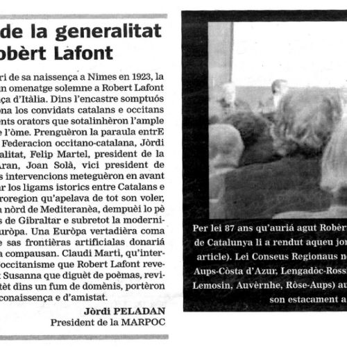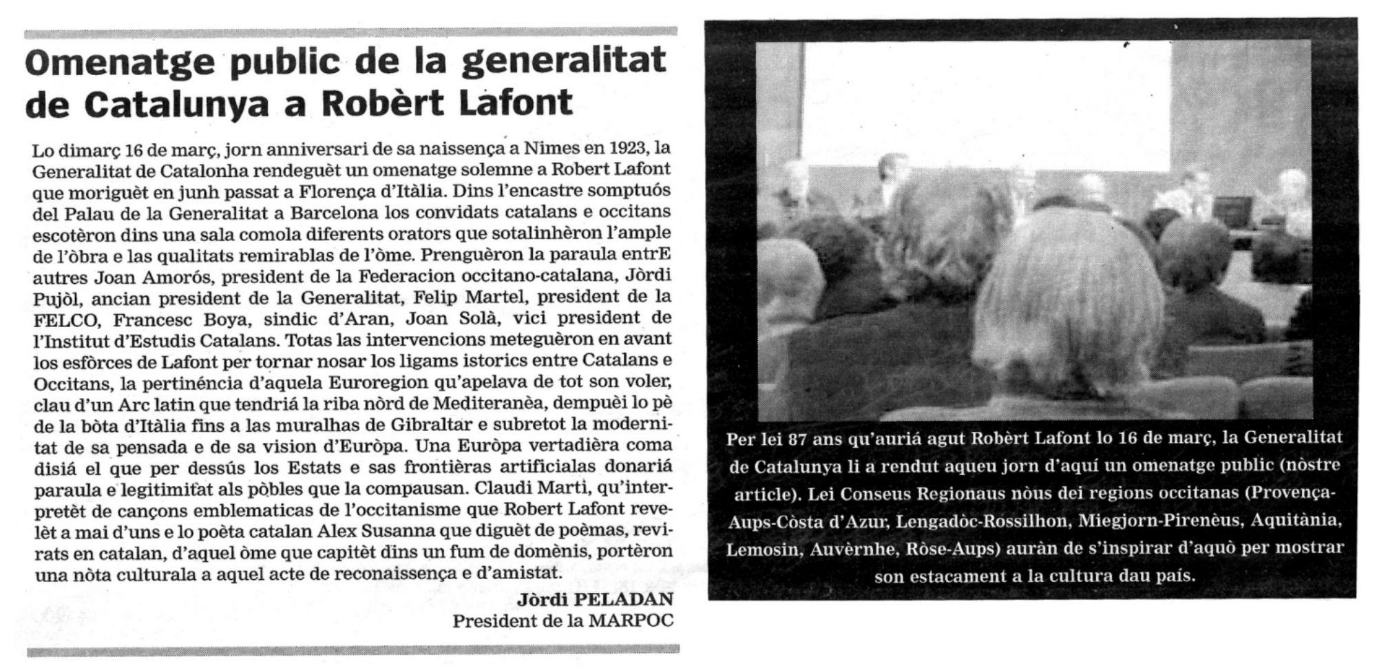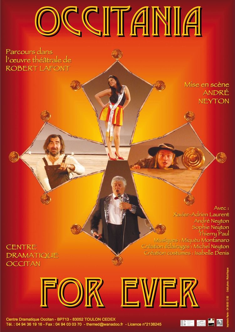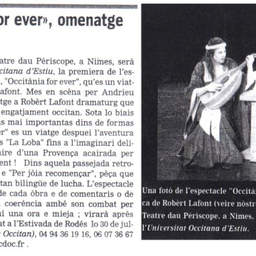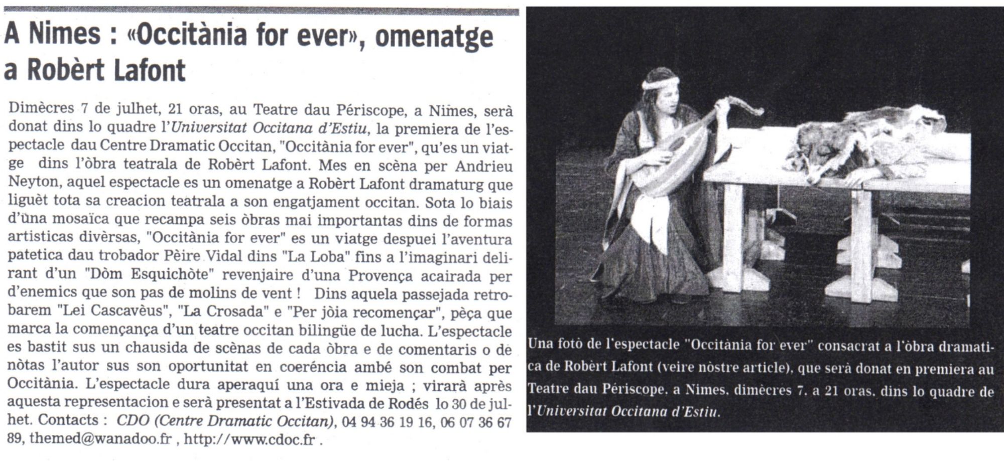 « Dimècres 7 de julhet, 21oras, au Teatre dau Périscope, a Nimes, serà donat dins lo quadre l’Universitat Occitana d’Estiu, la premiera de l’espectacle dau Centre Dramatic Occitan, « Occitània for ever », qu’es un viatge dins l’òbra teatrala de Robèrt Lafont. Mes en scéna per Andrieu Neyton, aquel espectacle es un omenatge à Robèrt Lafont dramaturg que liguèt tota sa cracion teatrala a son engatjament occitan. Sota lo biais d’una mosaïca que recampa seis òbras mai importantas dins de formas artisticas divèrsas, « Occitània for ever » es un viatge despuei l’aventura patetica dau trobador Pèire Vidal dins « La Loba » fins a l’imaginari delirant d’un « Dòm Esquichòte » revenjaire d’una provença acairada per d’enemics que son pas de molins de vent ! Dins aquela passejada retrobarem « Lei Cascavèus », « La Crosada » e « Per jòia recomençar », pèça que marca la començança d’un teatre occitan bilingüe de lucha. L’espectacle es bastit sus un chausida de scènas de cada òbra e de comentaris o de nòtas l’autor sus son oportunitat en coeréncia ambé on combat per Occitània. L’espectacle dura aperaqui une ora e mieja ; virarà après aquesta representacion e serà presentat a l’Estivada de Rodés lo 30 de julhet. » Mesclum – La Marseillaise