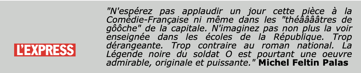 « Il faut courir voir "La légende noire du soldat O". Non seulement pour redécouvrir l'affaire scandaleuse du XVe Corps, ce corps d'armée provençal injustement accusé de lâcheté en 1914 et le destin tragique du soldat Odde, fusillé pour l’exemple, mais pour comprendre comment un siècle d'hystérie ethnique et politique anti-méridionale put justifier la manipulation du Gouvernement et de l'armée. Avec une grande économie de moyens, qui produit une efficacité théâtrale des plus grandes, servie par quatre comédiens de qualité, Neyton mêle la réalité et le rêve, le front et la maison, l'écrit raciste séculaire et le drame présent. Une réussite. » René Merle - La Marseillaise