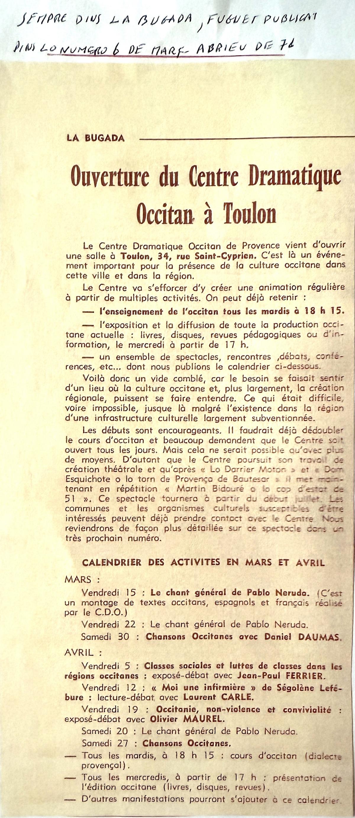 Le Local rue St Cyprien (La Bugada - 1971, La Dépêche 1973)