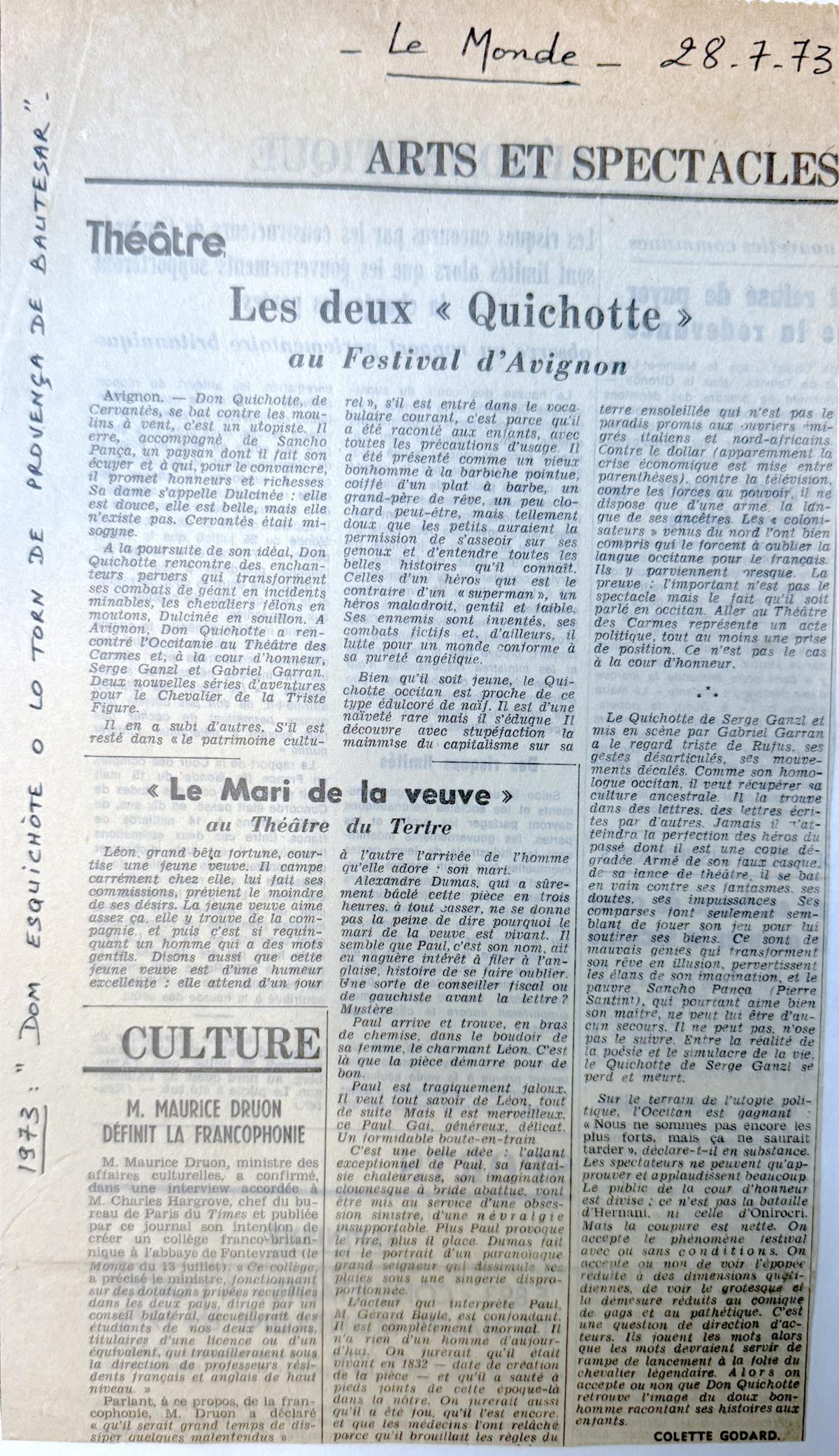 Les deux "Quichotte" au Festival d'Avignon (Le Monde - 1973)